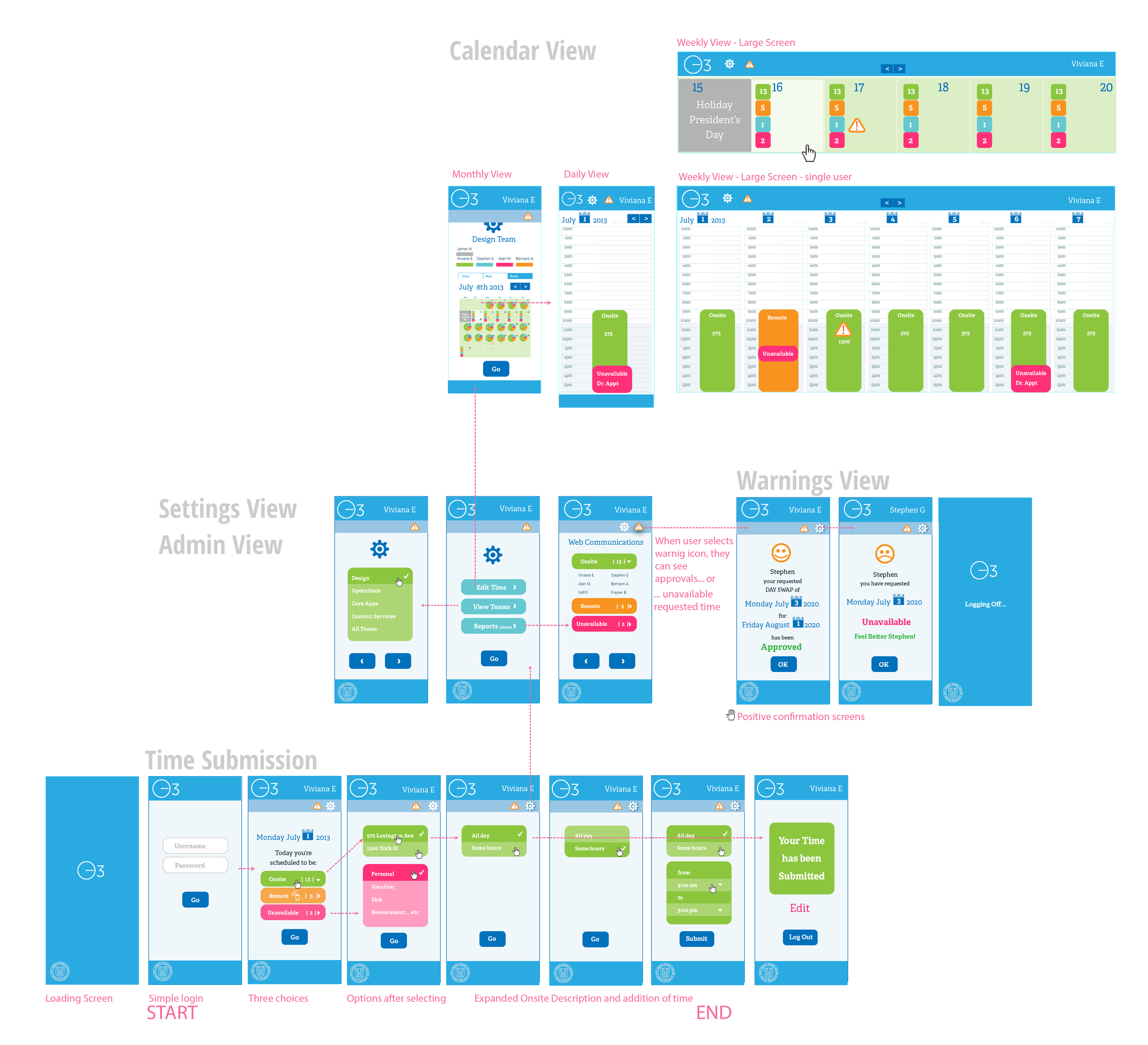 One application to submit weekly TimeSheets, request time off, swap days, and view attendance status reports.